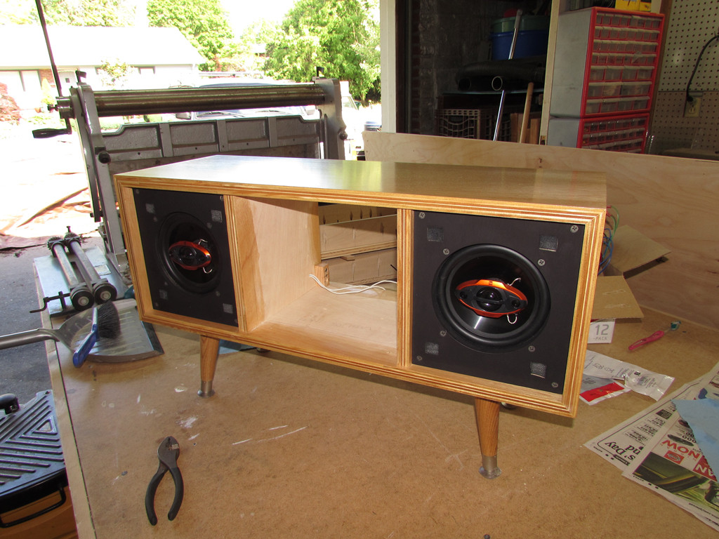 I was hoping for a blonde Heywood-Wakefield finish. I’ll have to experiment with getting that look, but the simple “natural” stain worked. Note the 4-way Dual 6.5″ speakers. The legs and mounts came from Lowe’s.